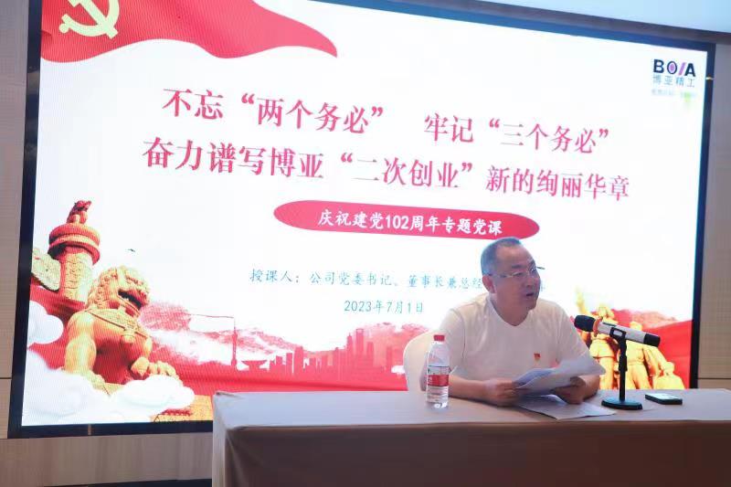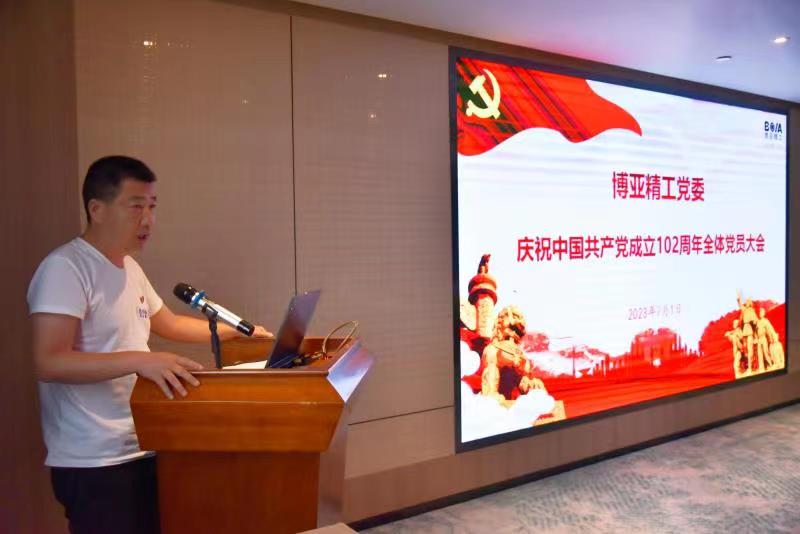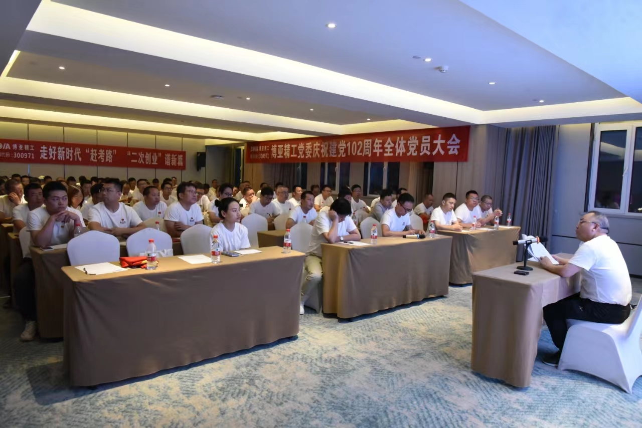 當(dāng)天晚上,在住宿酒店會議室組織召開了“慶祝建黨102周年全體黨員大會”。會議舉行了老黨員重溫入黨誓詞和預(yù)備黨員入黨宣誓儀式,黨委書記李總給預(yù)備黨員發(fā)放了《黨章》和《政治生日賀卡》。在會上表彰了公司2022—2023年度優(yōu)秀共產(chǎn)黨員,杜紅波、周微、馮攀、李波、劉軍5名同志獲此殊榮。隨后優(yōu)秀黨員代表劉軍作了表態(tài)發(fā)言,公司黨委委員輪流圍繞各自分管黨務(wù)工作談了認(rèn)識和體會。最后,黨委書記李總以《不忘“兩個(gè)務(wù)必”、牢記“三個(gè)務(wù)必”,奮力譜寫博亞“二次創(chuàng)業(yè)”新的絢麗華章,爭做市場經(jīng)濟(jì)條件下的道德模范》為題向大家講授了專題黨課。
