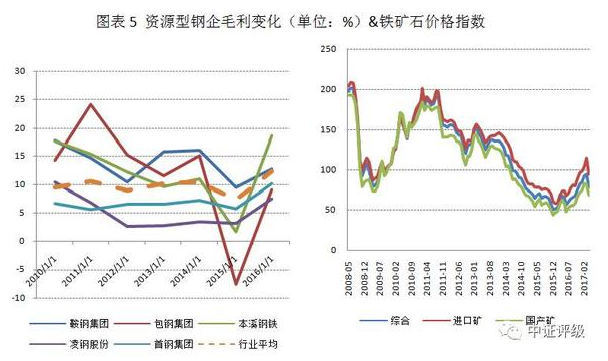 資源型鋼企的毛利率變動(dòng)與鐵礦石價(jià)格的變化趨勢(shì)一致,2013年之后受全球尤其是中國(guó)鋼鐵產(chǎn)能過剩影響鐵礦石價(jià)格快速下行,資源型鋼企的毛利率進(jìn)而惡化,且惡化趨勢(shì)要顯著大于行業(yè)平均水平。2016年下半年鐵礦石價(jià)格的回暖也帶動(dòng)資源型鋼企毛利的恢復(fù)。