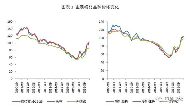 市場(chǎng)供需狀況的改善帶動(dòng)鋼材價(jià)格的回升,螺紋鋼、長(zhǎng)材等建筑鋼材以及板材價(jià)格在2016年二季度觸底后至今漲幅接近100%。