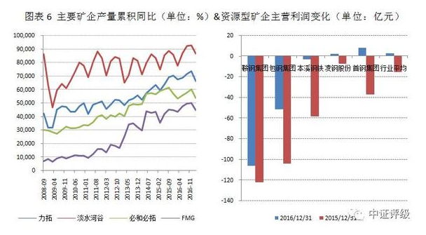 但從中長(zhǎng)期來看,資源型鋼企歷史上的相對(duì)競(jìng)爭(zhēng)優(yōu)勢(shì)已愈發(fā)不明顯,首先隨著國(guó)外淡水河谷、必和必拓等主流礦企2013年之前新建優(yōu)質(zhì)鐵礦的持續(xù)投產(chǎn)以及隨著國(guó)內(nèi)廢鋼累積率逐步提升對(duì)鐵礦石的替代作用不斷加強(qiáng),鐵礦石市場(chǎng)供求將逐漸步入買方市場(chǎng),國(guó)內(nèi)鐵礦石的品味和成本劣勢(shì)將越發(fā)明顯,資源型鋼企長(zhǎng)期依賴的競(jìng)爭(zhēng)優(yōu)勢(shì)或轉(zhuǎn)化為劣勢(shì)。從鐵礦石價(jià)格的變化趨勢(shì)可以看出,鐵礦石價(jià)格在2016年下半年持續(xù)回升,但已難以恢復(fù)到前期平均水平。本輪鋼鐵行業(yè)周期性回暖背景下,資源型鋼企盈利狀況的恢復(fù)明顯弱于行業(yè)平均。