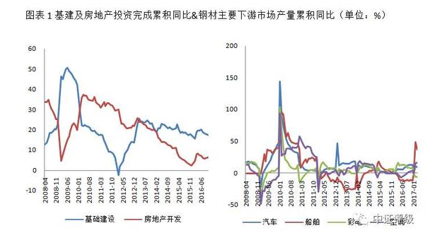 2016年下半年和2017年一季度,鋼鐵市場(chǎng)整體回暖,上游環(huán)保限產(chǎn)、淘汰中頻爐等落后產(chǎn)能以及下游經(jīng)銷商補(bǔ)庫存、地方政府加大基建投資等因素疊加,市場(chǎng)供需狀況趨于好轉(zhuǎn)。房地產(chǎn)投資和基建投資領(lǐng)域接連發(fā)力帶動(dòng)建筑鋼材下游市場(chǎng)需求的上升,汽車、空調(diào)等板材主要下游市場(chǎng)從2016年上半年開始也有恢復(fù)性增長(zhǎng)。